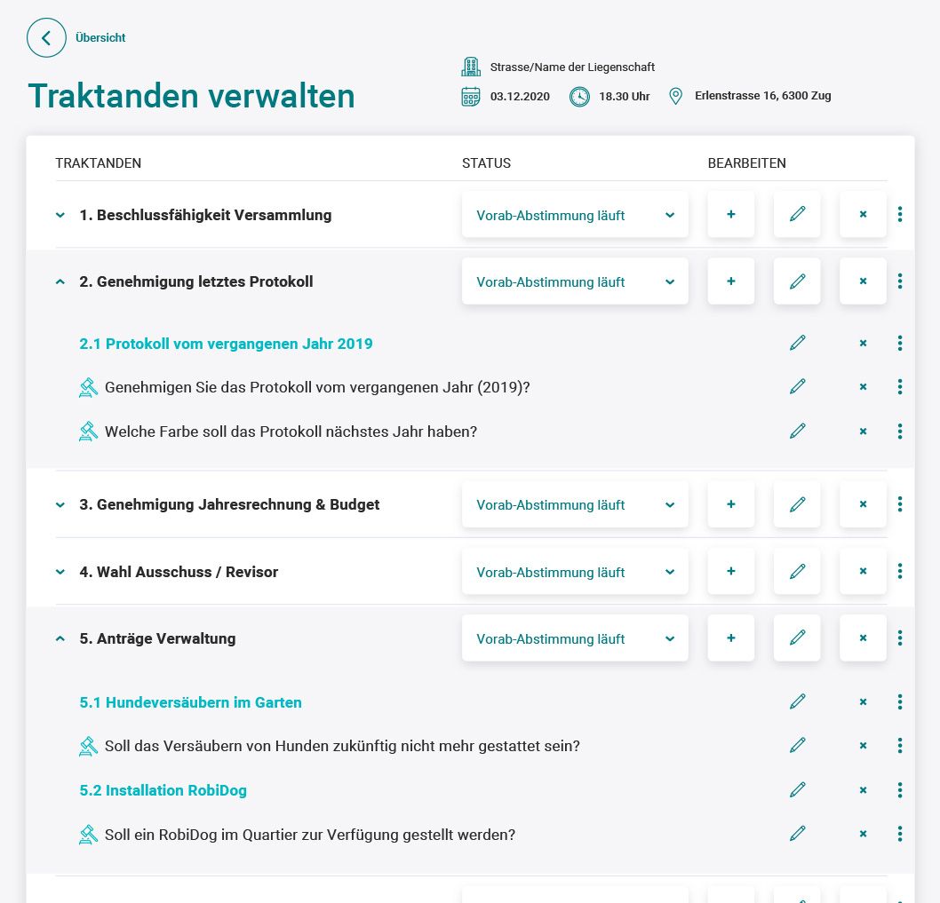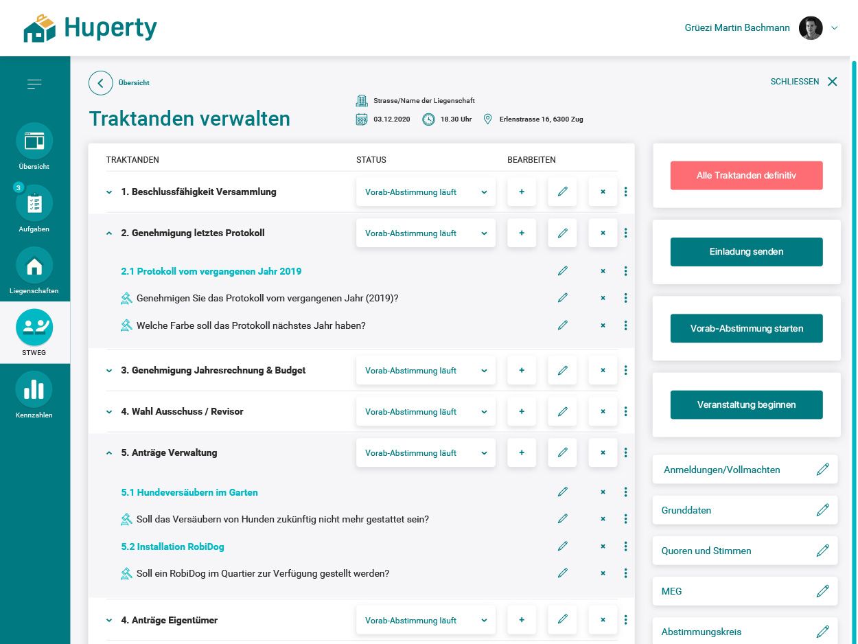 The annual condominium owners' meeting is a key moment for condominium owners' associations, but is often associated with time-consuming processes and mountains of paperwork. Huperty set itself the goal of digitising this necessary process and at the same time mapping legally binding decision-making processes. The functionality was expanded to include additional areas for reporting repair cases to the property management company, which in turn coordinates the work with tradespeople. Our task was to design the entire UX/UI of the platform, focussing on clear processes, intuitive navigation and ease of use. Users were to be guided through the application at all times, whether they wanted to make arrangements or place repair orders.