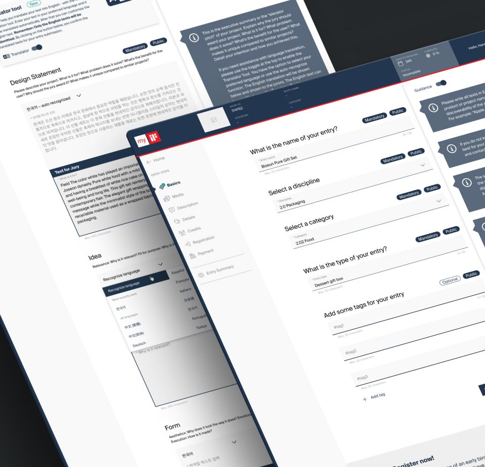 With myiF, we co-created an internationally accessible platform that offers design professionals an intuitive entry point into the award-submission process – from easy registration to winner communication. Fast-track entry, comprehensive status indicators, and contextual guidance make submissions faster and more accurate. A personalized dashboard welcomes users with latest information and relevant todos, while multilingual micro-guides provide orientation at every step.